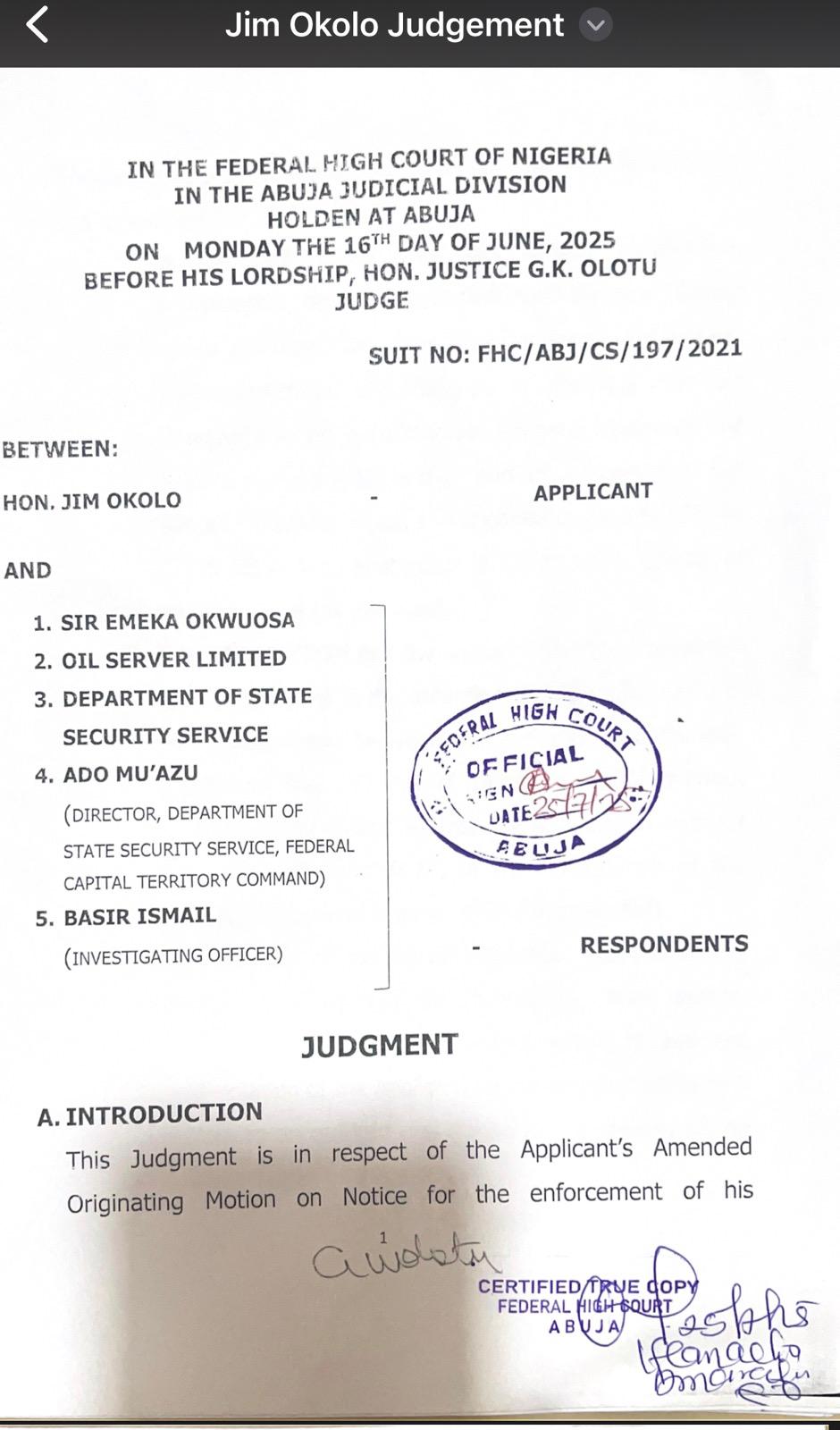 Chief Okolo is also facing prosecution in FRN v. Jim Okolo & 3 Ors. (Charge No: CR/109/22), before Justice S.U. Bature of the FCT High Court, Maitama, Abuja. The 17-count charge includes allegations of criminal intimidation, fabrication of evidence, giving false information to mislead public officers, and perjury.